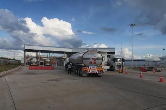 ▲ 满载成品油的油罐车从终端罐区驶往泰国东北部各地。帕拉米摄