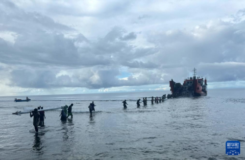 在所罗门群岛瓜达尔卡纳尔省,当地村民搬运中国援助宽带网络项目所需的物资(4月19日摄,手机照片)。