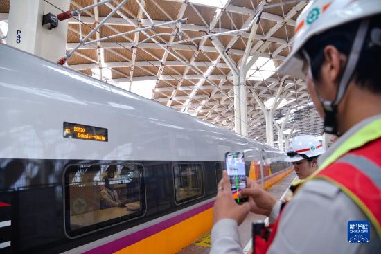 5月22日,在印度尼西亚雅加达哈利姆车站,工作人员拍摄即将进行联调联试的雅万高铁综合检测列车。新华社记者 徐钦 摄